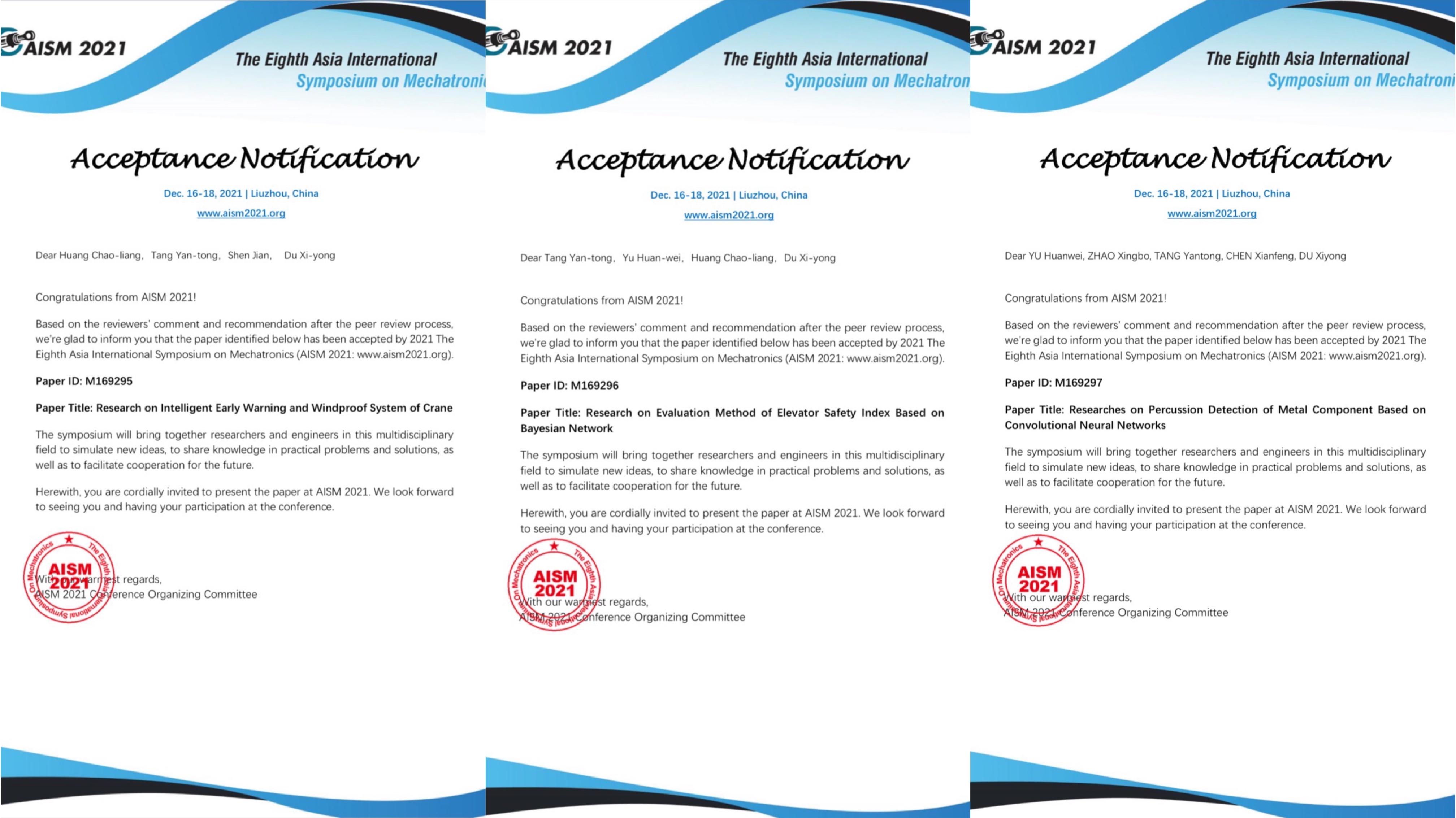 近日,紹興特檢院收到喜報,由該院科研人員撰寫的《Researches on Percussion Detection of Metal Component Based on Convolutional Neural Networks》等3篇論文通過第八屆亞洲機械電子學國際學術會議專家評審,將收錄于會議論文集《Proceedings of the 8th Asia International Symposium on Mechatronics》,計劃由Springer出版社正式出版。