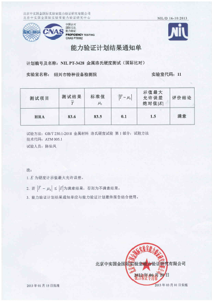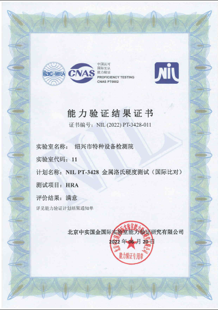 紹興市特檢院洛氏硬度國際比對獲滿意結(jié)果