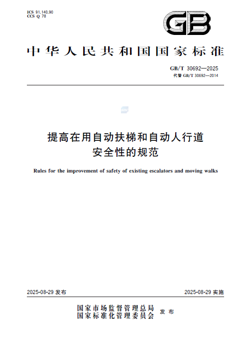 紹興特檢院參與修訂的國家標準GB/T 30692-2025《提高在用自動扶梯和自動人行道安全性的規范》于2025年8月29日批準發布實施。