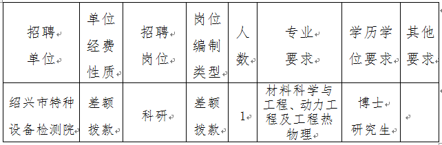 因工作需要,根據《紹興市事業單位公開招聘工作實施細則》(紹政辦發〔2016〕64號)有關精神,紹興市市場監督管理局下屬事業單位紹興市特種設備檢測院擬面向社會公開招聘事業編制人員,現公告如下: